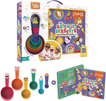 Initiez vos enfants à la pâtisserie avec le Coffret Kids : Les gâteaux et desserts Chefclub Kids, comprenant un livre de 25 recettes illustrées et six tasses doseuses adaptées.