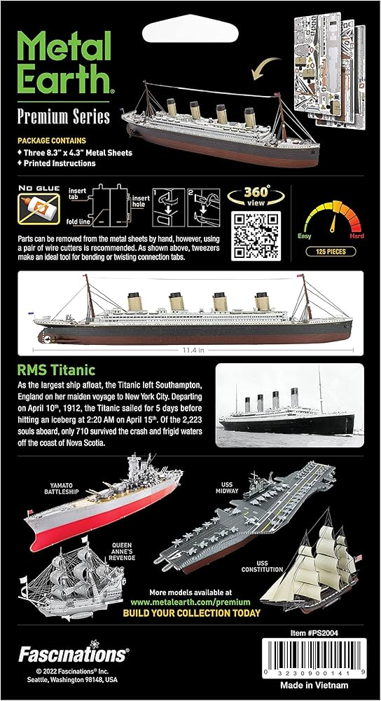 Assemblez une réplique détaillée du RMS Titanic avec ce puzzle 3D métallique de Metal Earth. Sans colle ni peinture, ce modèle offre une expérience de construction enrichissante pour les passionnés de modélisme.