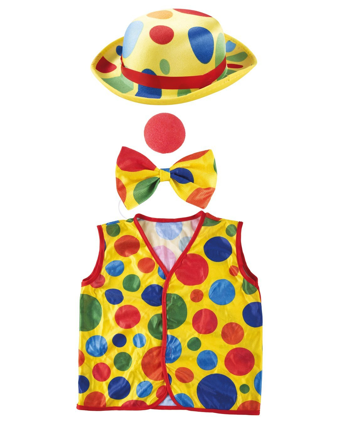 Transformez votre enfant en un clown joyeux avec le set de déguisement P'tit Clown, comprenant un chapeau, un gilet, un nœud papillon et un nez rouge, idéal pour les fêtes costumées.