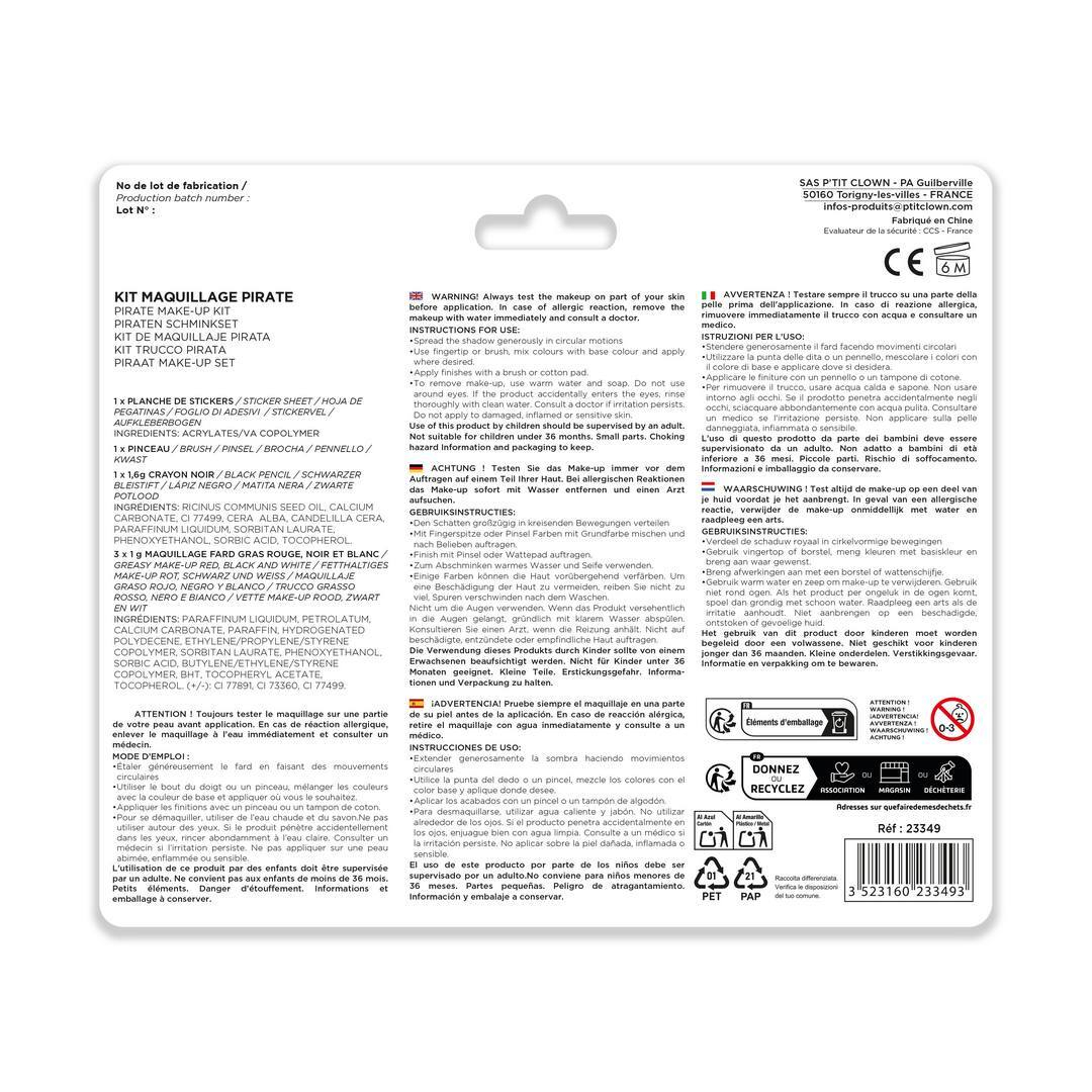 Transformez votre enfant en véritable pirate avec le Kit Maquillage Pirate de P'tit Clown. Ce kit complet comprend :