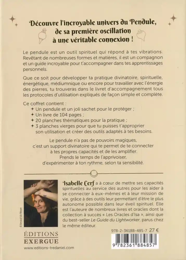 Ce coffret contient : Un pendule et un joli sachet pour le protéger ; Un livre de 104 pages ; 20 planches thématiques pour la pratique ; 3 planches vierges pour que tu puisses t'approprier son utilisation et créer des outils adaptés à tes besoins. Le pendule n'a pas de pouvoirs magiques, c'est un support divinatoire qui te permet de te connecter à tes propres capacités et de les amplifier. Prends le temps de l'apprivoiser, d'expérimenter à ton rythme, selon ta sensibilité.