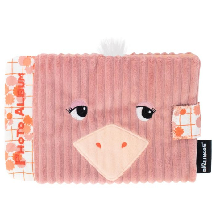 Album photo en velours Pomelos l'Autruche de Les Déglingos, idéal pour conserver 10 photos 10 x 15 cm. Doux, coloré et lavable en machine, parfait dès la naissance.