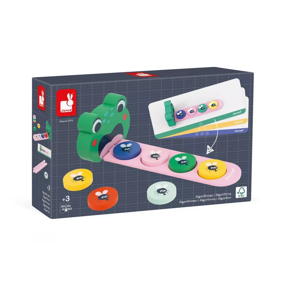 C'est parti pour un temps de jeu et d'apprentissage avec notre grenouille gourmande ! Au menu, 36 belles mouches ! Mais attention notre batracien est exigeant, il y a un ordre à respecter pour bien digérer ces succulents mets ! Dès 3 ans, proposez aux enfants de s'amuser grâce aux suites logiques, afin de renforcer par la même occasion les apprentissages de la maternelle et entrainer leur acuité visuelle. Ce jeu éducatif permettra aux enfants d'apprendre à différencier les couleurs et à identifier une suite logique. Il est adapté aux enfants de petite, moyenne et grande section de maternelle. En prenant exemple sur les 12 cartes modèle recto-verso, ils devront reproduire une suite de couleurs. Une fois cette notion maitrisée, vous pourrez vous divertir à deux en accompagnant les enfants dans l'apprentissage des algorithmes et en simplifiant cette notion grâce notre jolie grenouille en bois. Sa longue langue, faite de 3 pièces en bois qui s'imbriquent, permet de déposer bon nombre de mouches et de répéter les suites.