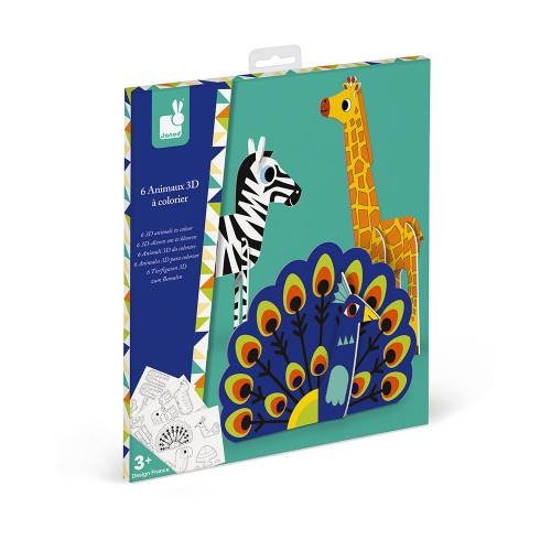 Le coffret 'Animaux 3D à colorier' de Janod permet aux enfants dès 3 ans de créer et personnaliser 6 animaux en volume en les coloriant et en les assemblant. Une activité ludique pour développer la motricité fine et l'imagination.