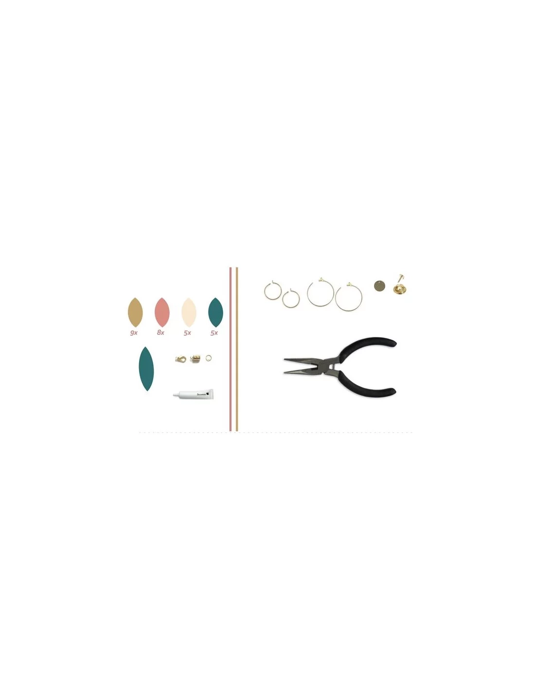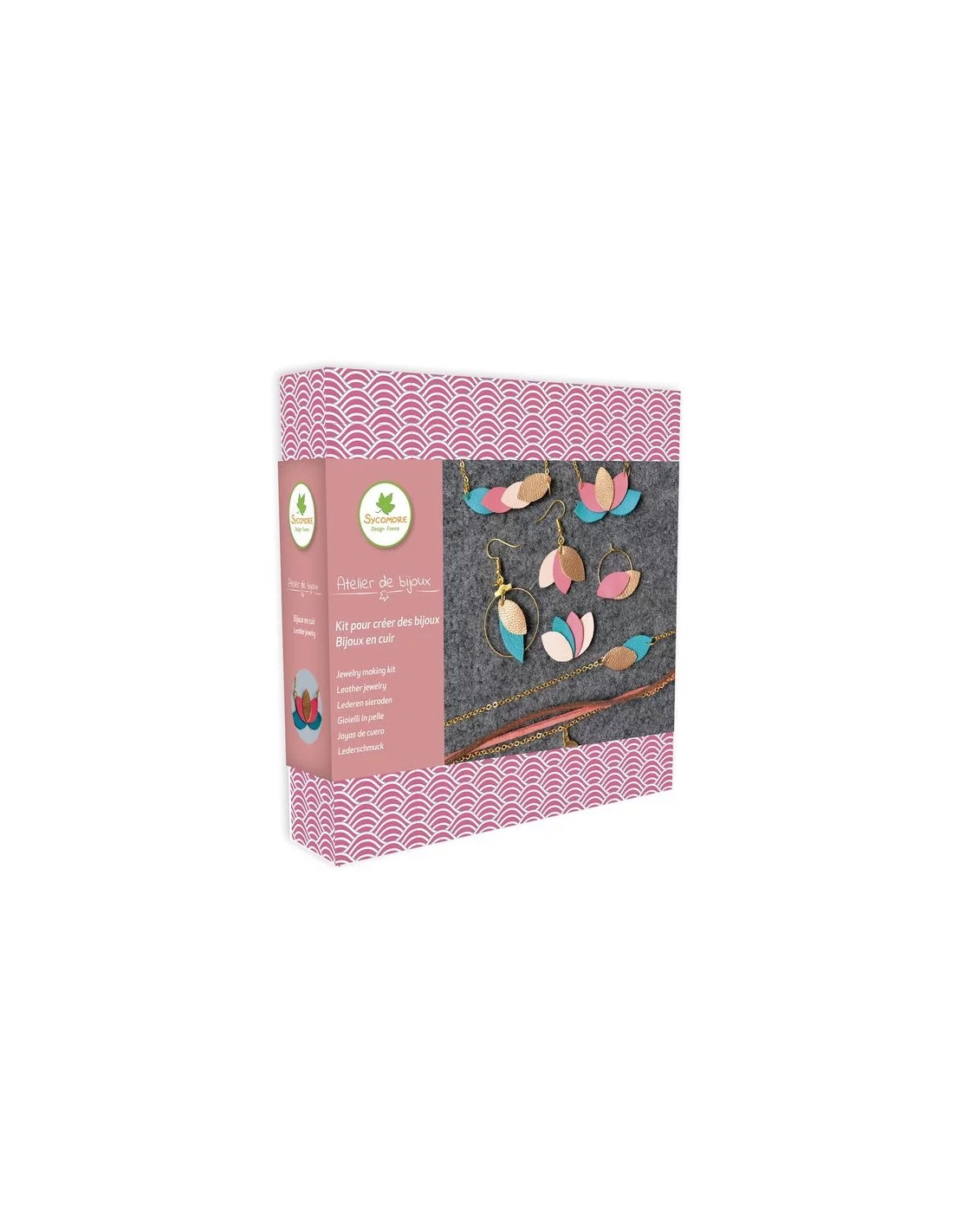 Coffret créatif pour enfants dès 12 ans, permettant de réaliser des bijoux en cuir personnalisés. Contient pièces de cuir, accessoires, outils et notice.