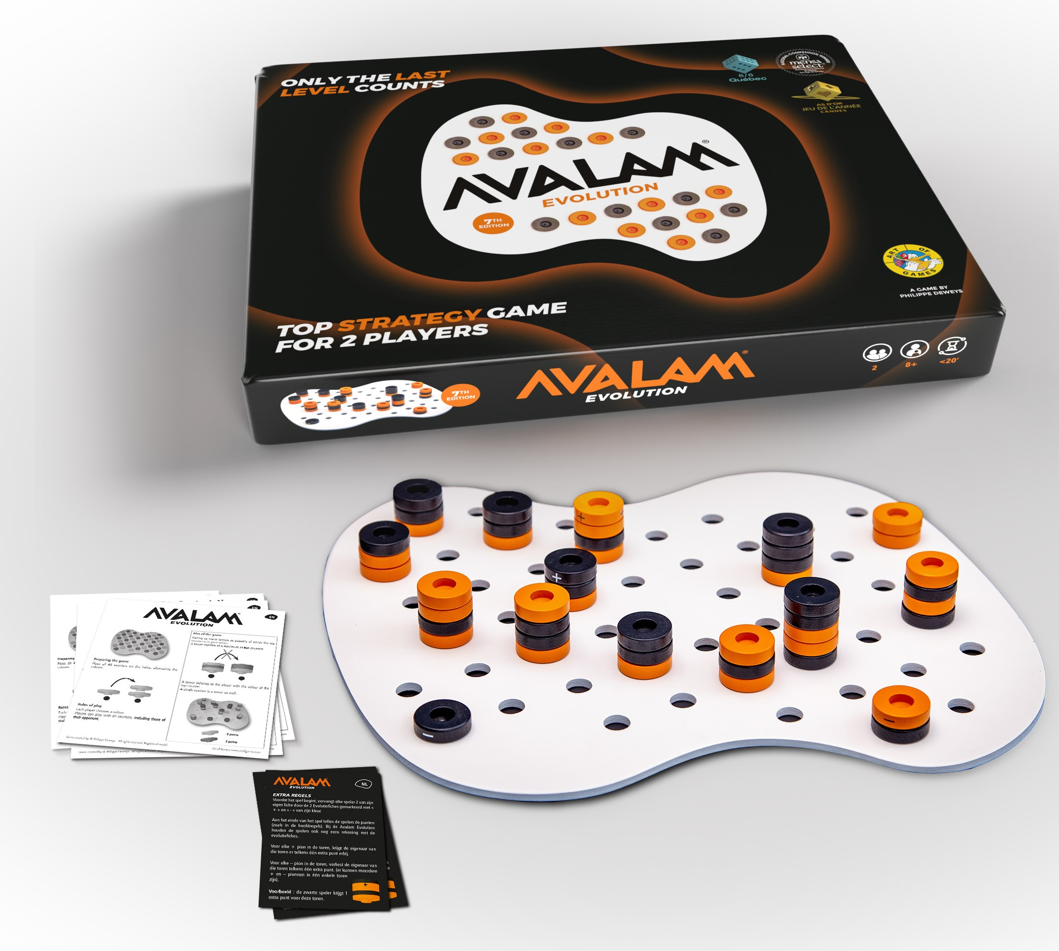 Avalam Zébulon est un jeu de stratégie pour deux joueurs dès 8 ans, où l'objectif est d'empiler des pions pour dominer le plateau. Cette édition inclut des pièces spéciales '+' et '-', ajoutant une nouvelle dimension stratégique. Parties rapides d'environ 20 minutes.