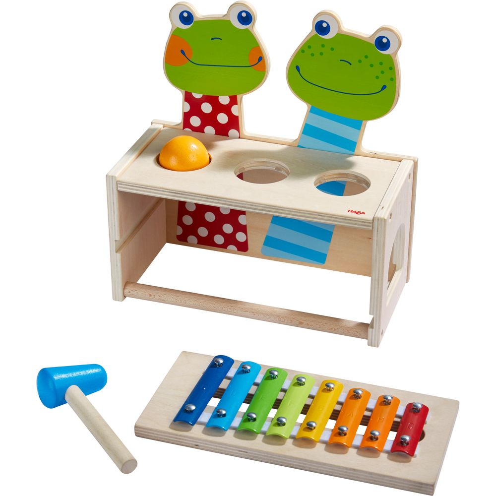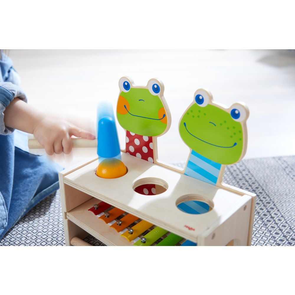 Le Banc à marteler musical 'Concert de grenouilles' de HABA est un jouet en bois 2-en-1 combinant un banc à marteler et un métallophone, idéal pour développer la motricité fine et l'éveil musical des enfants dès 2 ans.