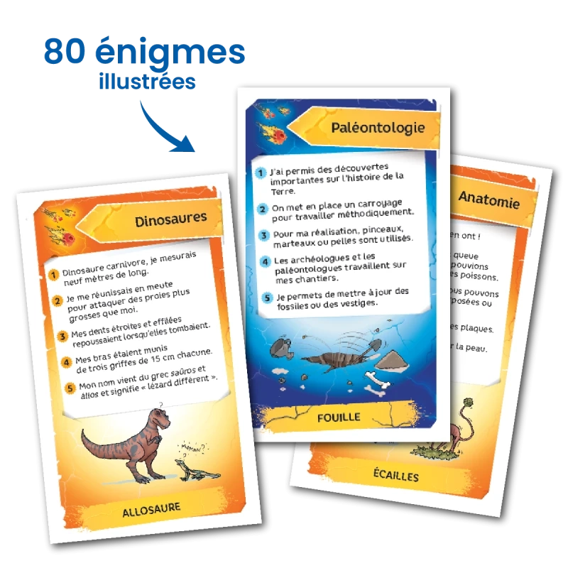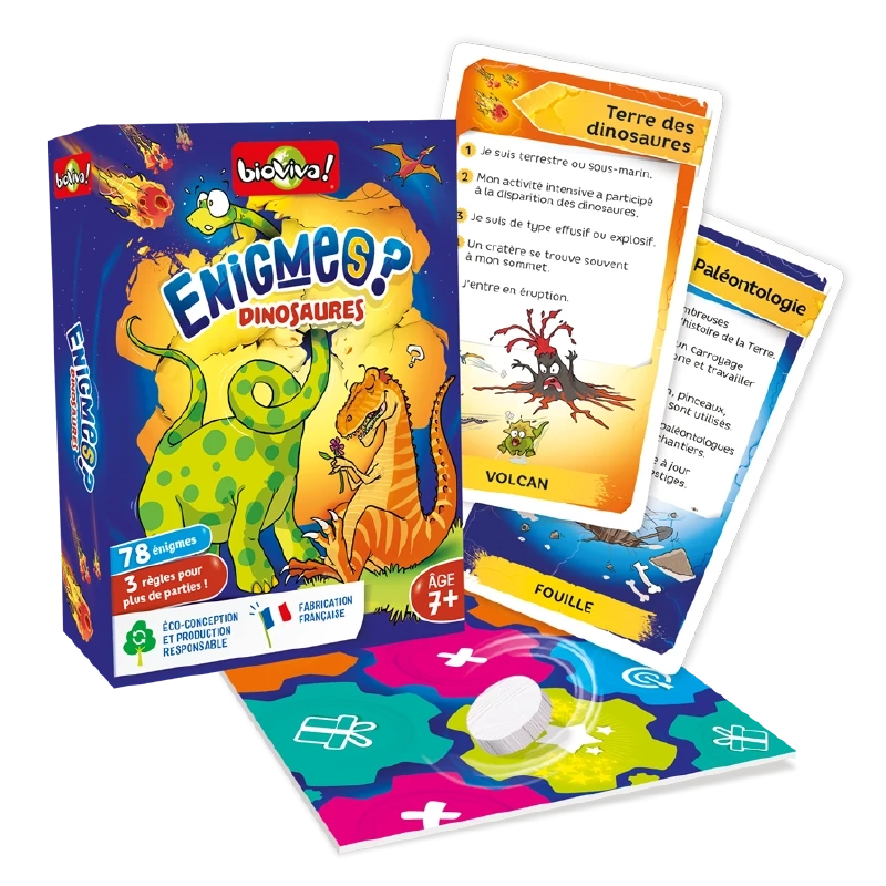 "Énigmes - Dinosaures" de Bioviva est un jeu éducatif pour enfants dès 7 ans, où les joueurs devinent des mots liés aux dinosaures à travers 5 indices amusants. Éco-conçu et fabriqué en France, ce jeu offre des moments ludiques en famille.