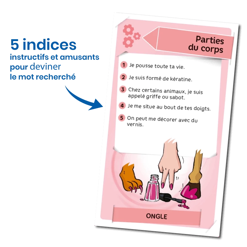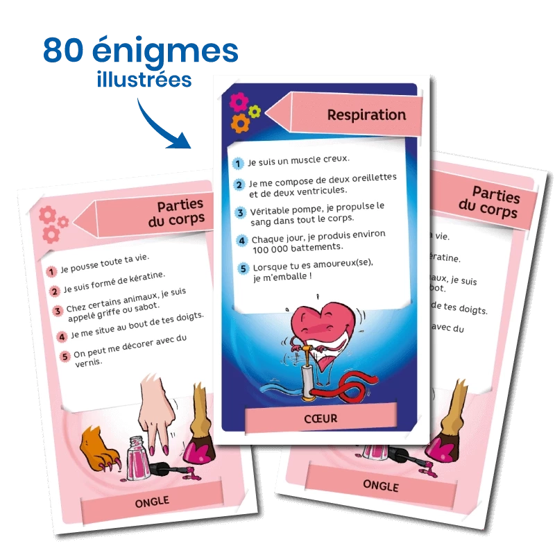 Énigmes - Corps Humain est un jeu éducatif de Bioviva pour les enfants dès 7 ans. Devinez des parties du corps humain à l'aide de 80 cartes illustrées et amusez-vous en famille. Fabriqué en France avec des matériaux éco-responsables.