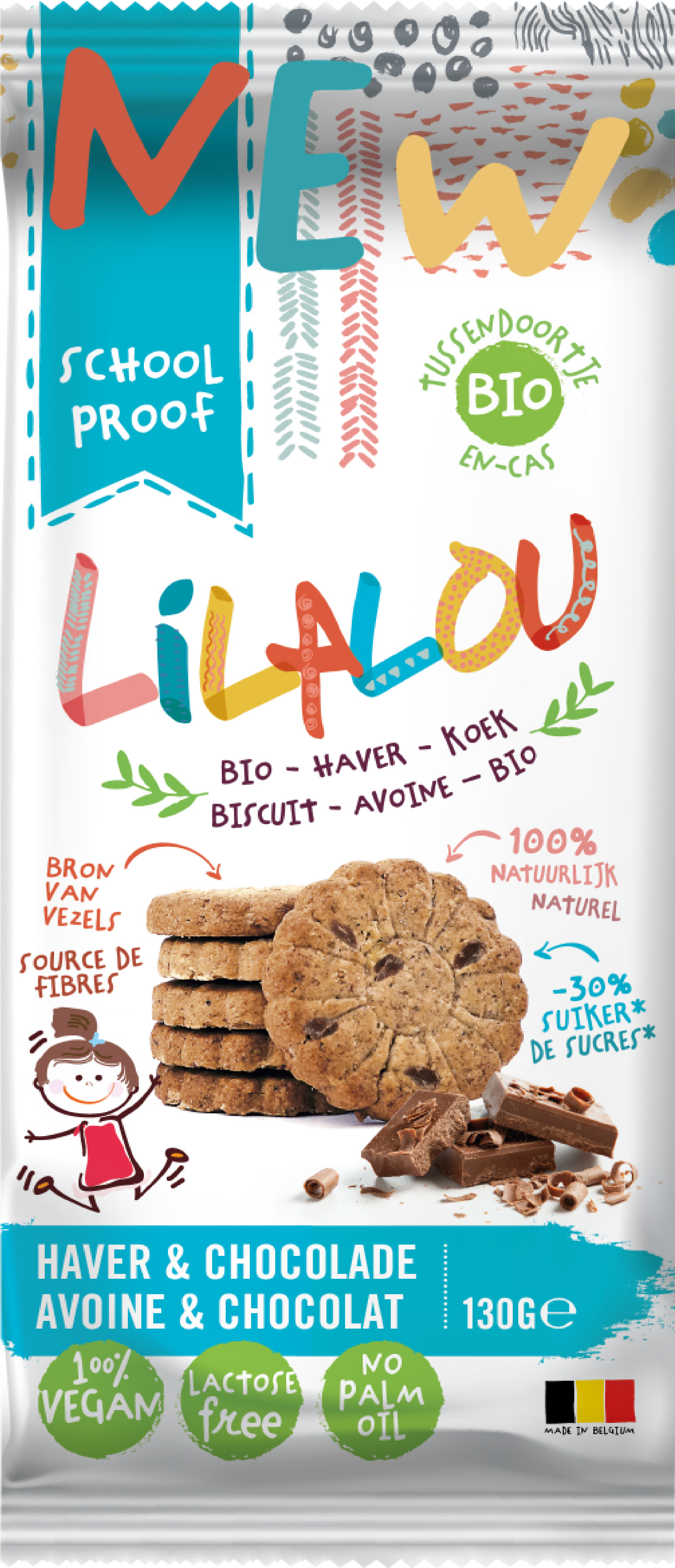 FR Ingrédients : céréales 60% [avoine 31% (flocons d'avoine*, farine d'avoine*) farine de blé*, farine d'orge*] huile de tournesol*, beurre de cacao*, sirop de chocolat noir* (10%) (pâte de cacao*, sucre de canne*, beurre de cacao*, arôme (vanille*), sucre de canne brut*, sirop de maïs*, fibres d'acacia*), protéine de pois*, mélasse*, poudre à lever (bicarbonate de sodium), poudre de cacao, tartre, sel marin (*)= provenant d'une production biologique contrôlée