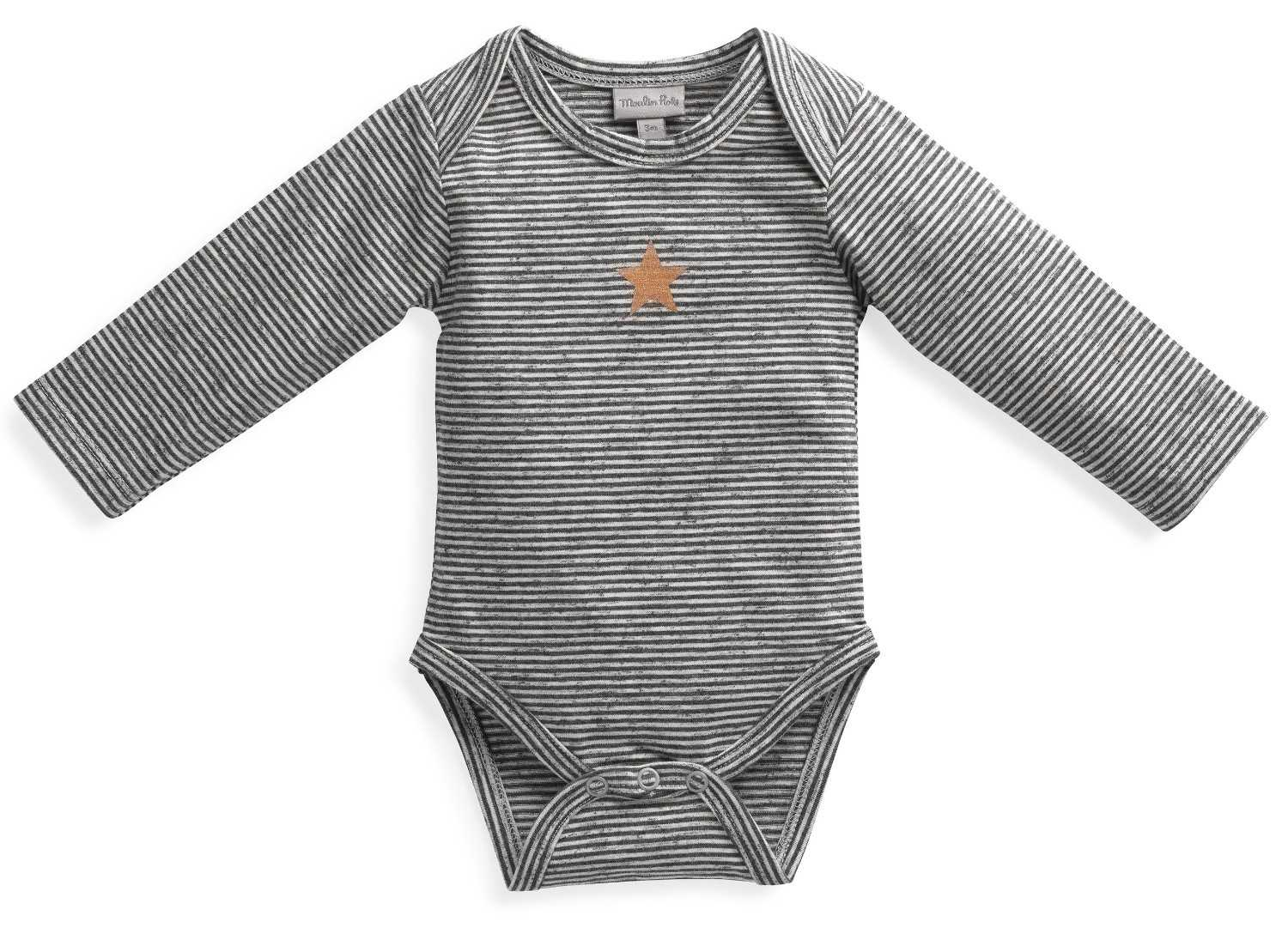 Body manches longues en jersey rayé beige et noir avec sérigraphie étoile cuivrée. Fermeture entrejambe par boutons - pression.