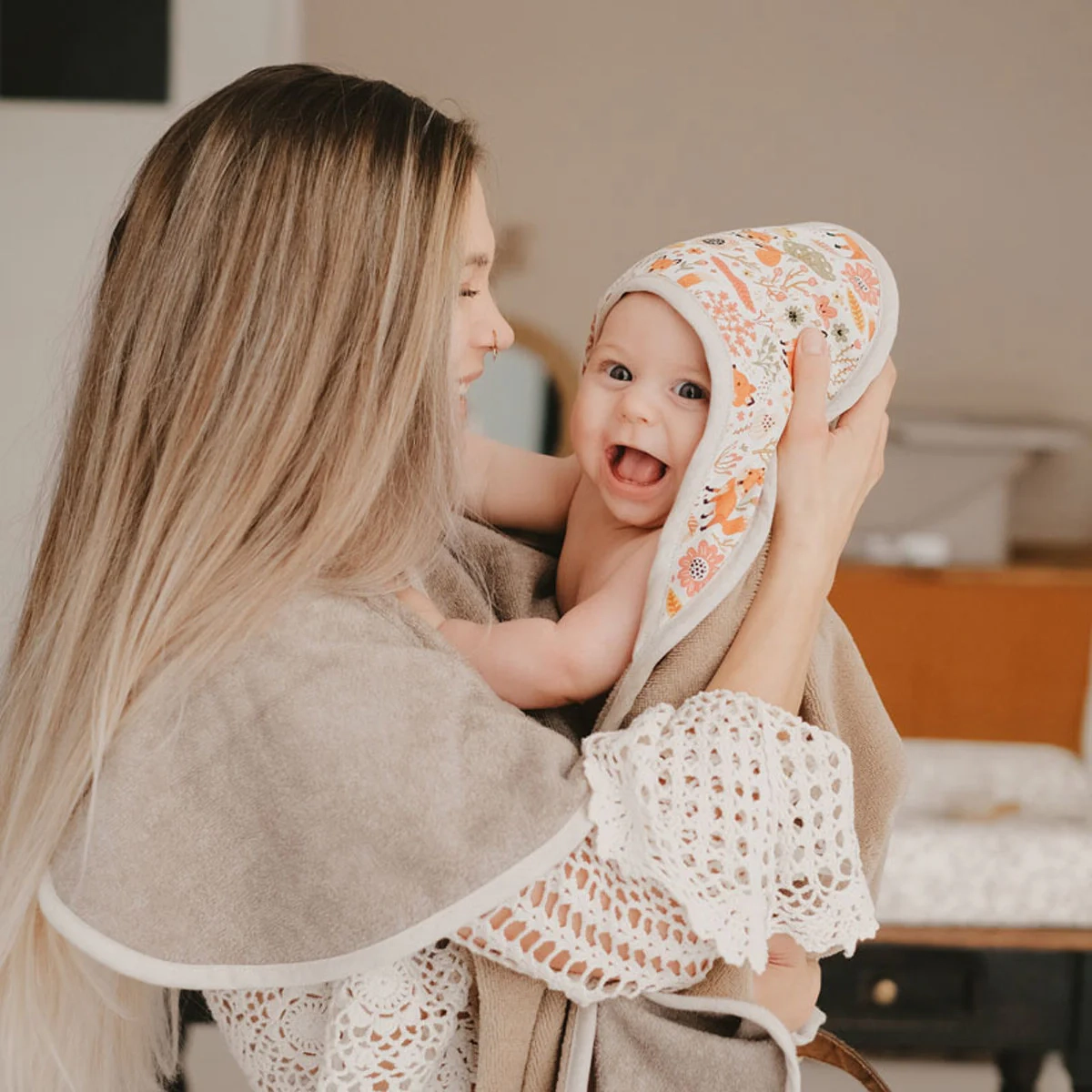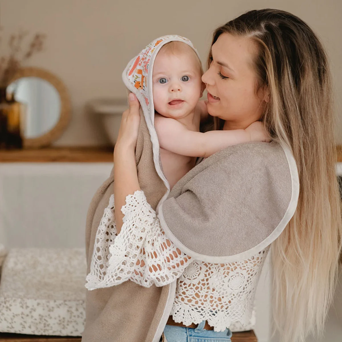 La Cape de bain tablier Forêt enchantée de Néobulle est une serviette 2-en-1 pratique et douce, conçue pour sécher et réchauffer bébé après le bain. Avec son imprimé élégant et sa fabrication française, elle allie confort et fonctionnalité.