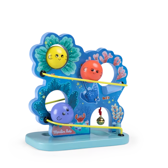 Découvrez la Cascade de boules Les Aventures de Paulie de Moulin Roty, un jouet d'éveil en bois aux couleurs de l'océan, idéal pour les enfants dès 18 mois. Ce jeu comprend une structure en bois, trois boules illustrées de petits poissons et une clochette qui tinte à l'arrivée des boules, favorisant la motricité fine et la coordination œil-main.