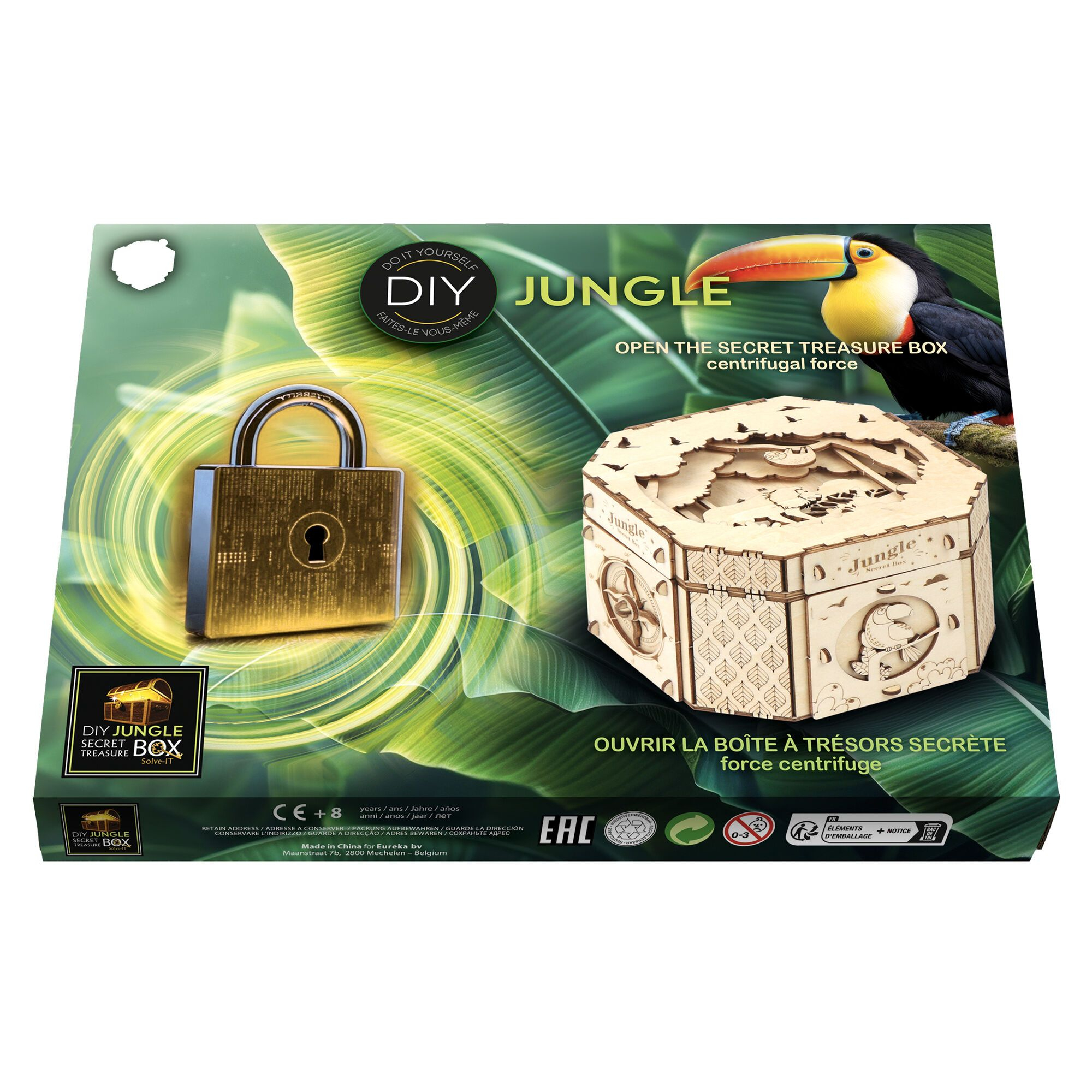 Assemblez et découvrez les secrets du Casse-tête DIY Jungle Secret Treasure Box de Recent Toys, une boîte en bois aux motifs exotiques dissimulant un compartiment caché pour vos trésors.