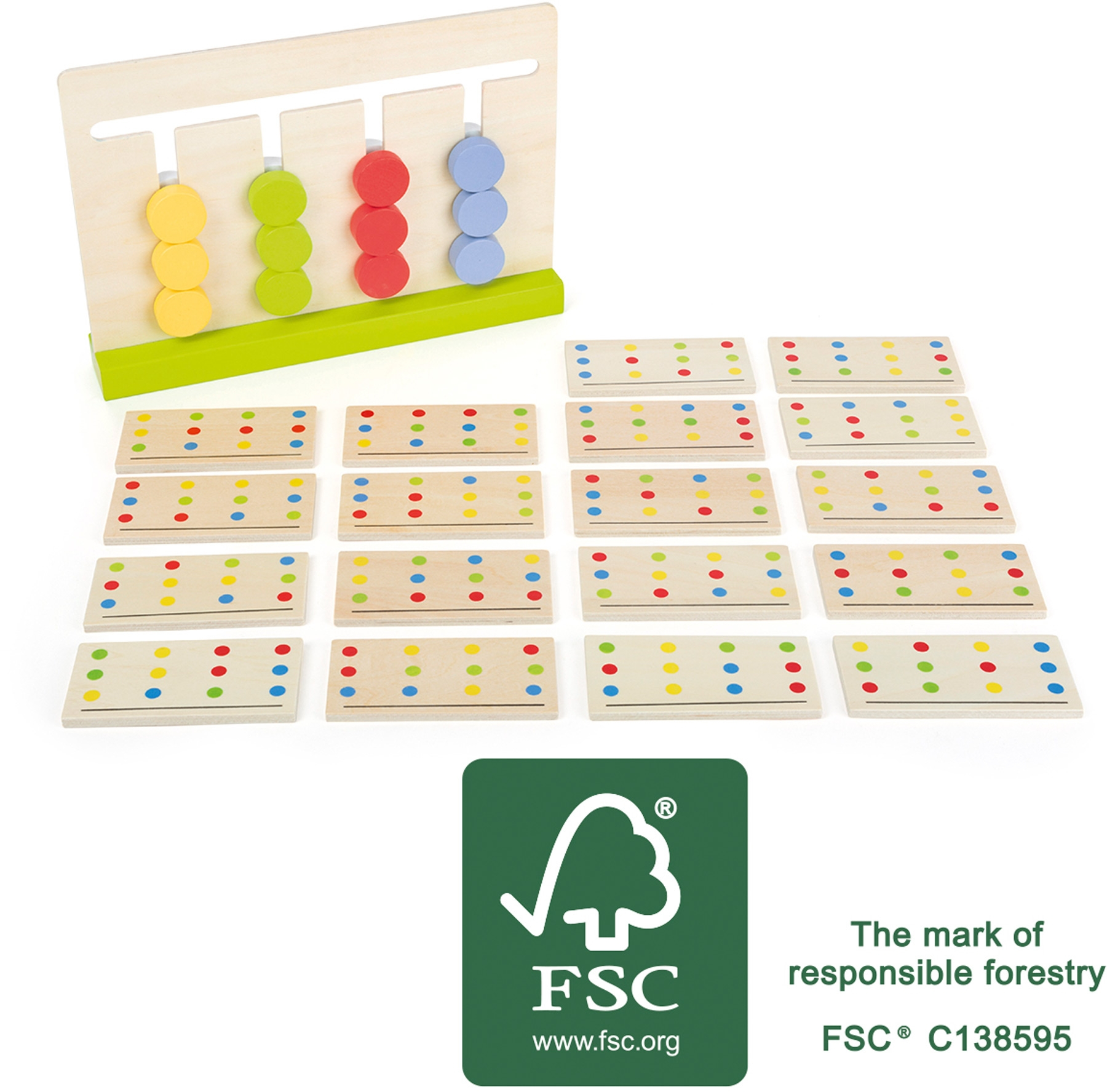 Logique et concentration sont de mise! Qui parvient à faire glisser au bon endroit les pièces de couleurs indiqués sur les plaquettes en bois? Le but de ce casse-tête en bois certifié FSC® 100% est de reproduire les schémas illustrés sur les différentes plaquettes. Mais attention, les pièces ne glissent pas toujours comme on le veut.... Un joli jeu pour apprendre les couleurs.