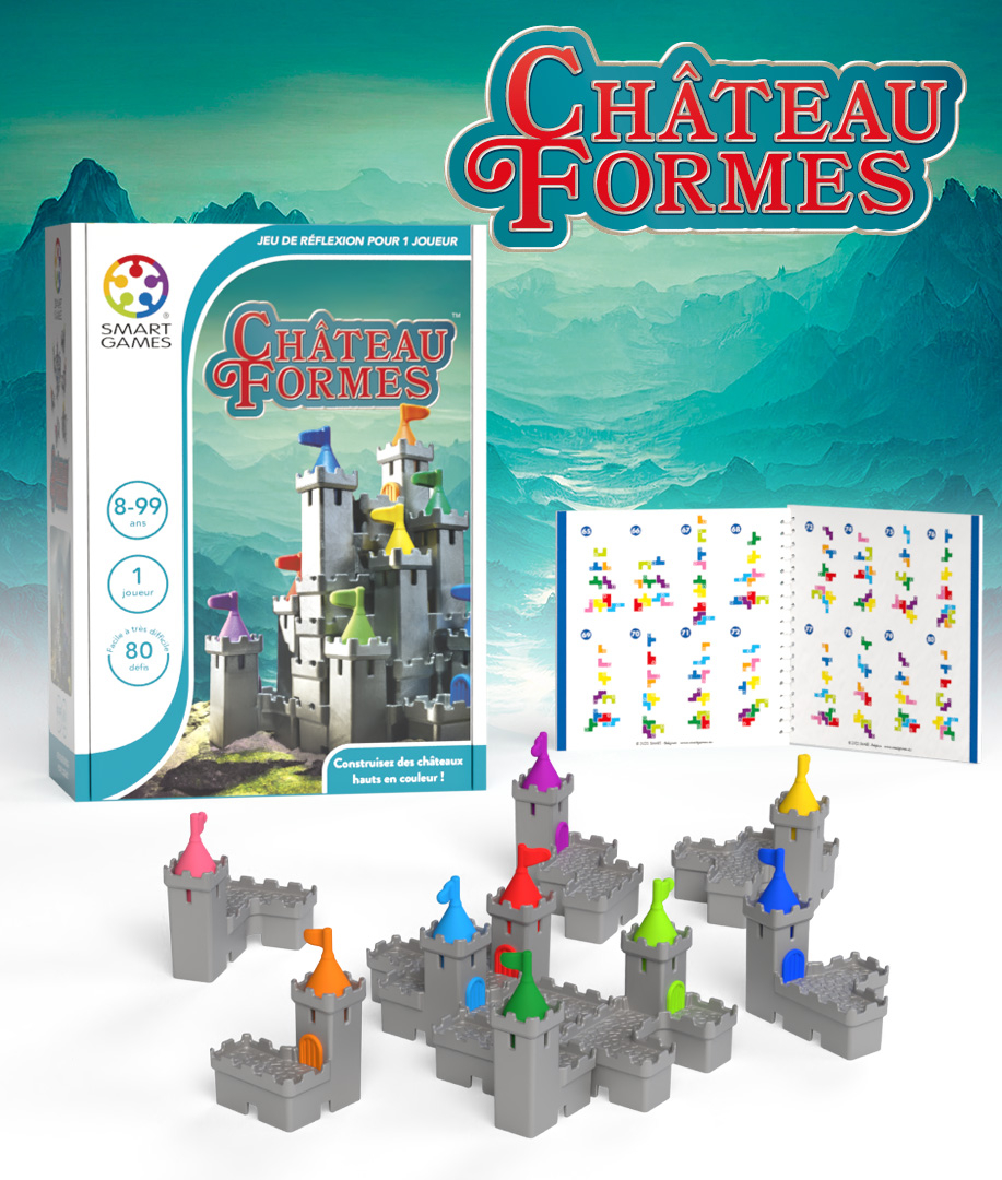 Château-Formes de SmartGames est un jeu de logique en 3D pour les 8 ans et plus, proposant 80 défis évolutifs pour construire des châteaux et développer des compétences cognitives clés.