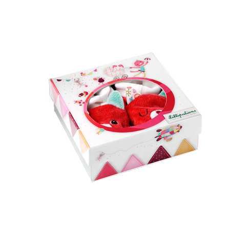 Une paire de petits chaussons de naissance à leffigie de Colette le chat, présentée dans sa jolie boîte en carton, idéale pour un cadeau de naissance. Tes petits pieds seront à croquer !