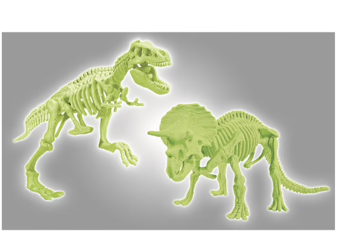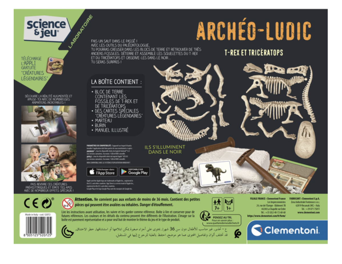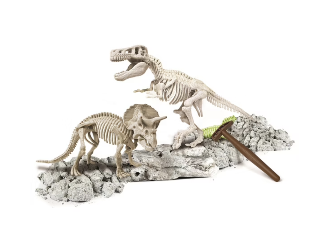 Les petits archéologues peuvent recréer la lutte féroce entre le prédateur et sa proie grâce à ce coffret scientifique. Il suffit de creuser dans les blocs de terrain à l'aide des outils et récupérer les fossiles de deux redoutables dinosaures : le T-Rex et le Tricératops.