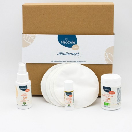 Le Coffret Allaitement de Néobulle est un ensemble complet de soins biologiques incluant une huile de massage, un soin pour mamelons, des gélules de soutien à la lactation et des coussinets d'allaitement lavables, conçu pour accompagner les mamans dans leur parcours d'allaitement en toute sérénité.