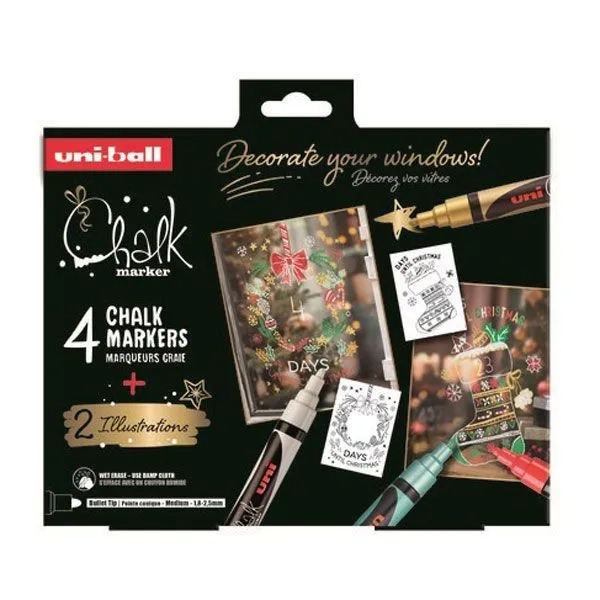 Décorez vos vitres avec le Coffret de Noël CHALK MARKERS : 4 marqueurs craie aux couleurs traditionnelles et 2 illustrations à reproduire pour des fêtes personnalisées.