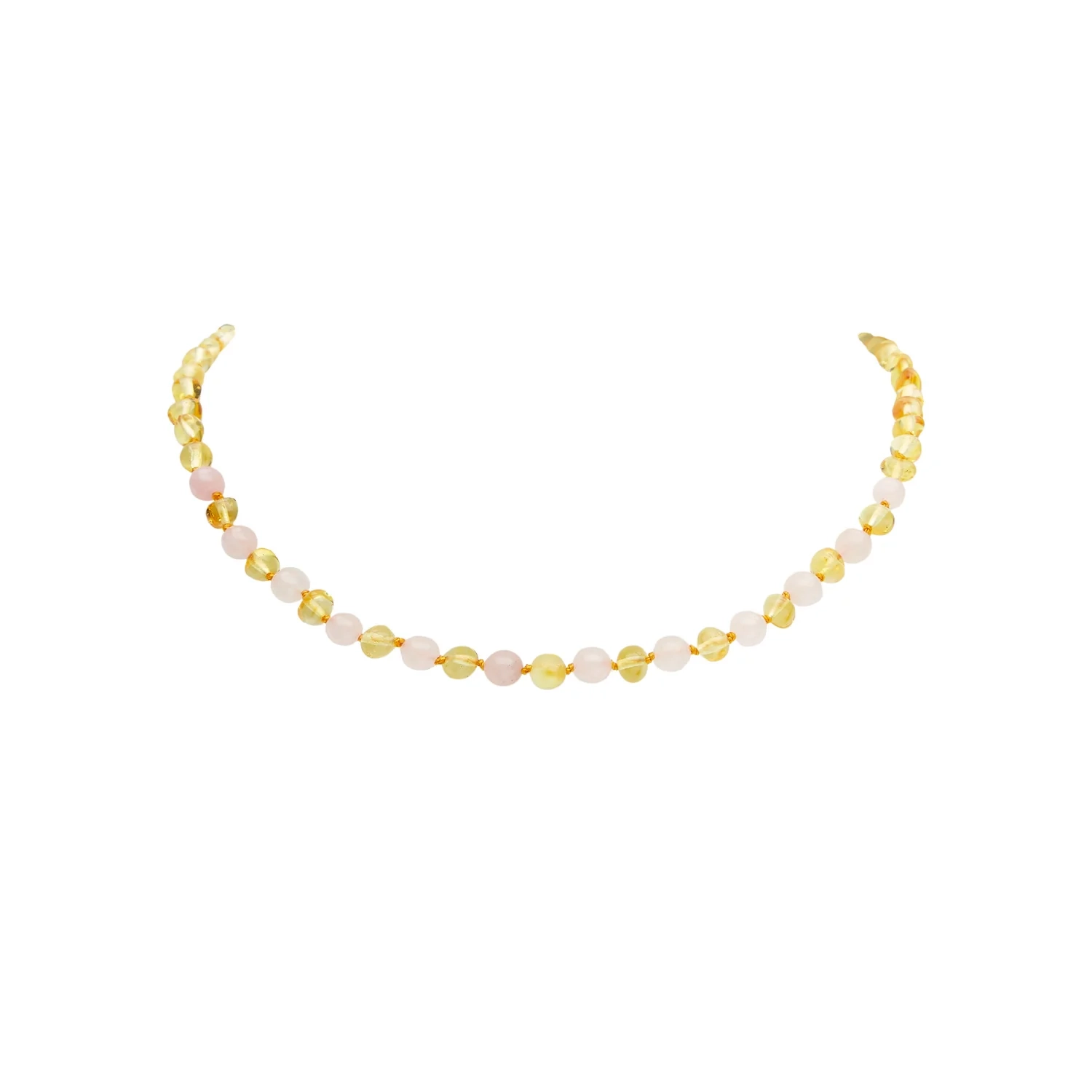 Offrez ce superbe collier "Amour et Lumière" en quartz rose et ambre à votre bébé, pour lui permettre de bénéficier d’une énergie à la fois réconfortante et revitalisante.Pierre du chakra du cœur, le quartz rose qui compose ce collier enveloppera ce centre d’énergie pour éveiller compassion et amour inconditionnel. Il sera particulièrement bénéfique pour apaiser les émotions lourdes telles que la tristesse ou le sentiment de solitude.