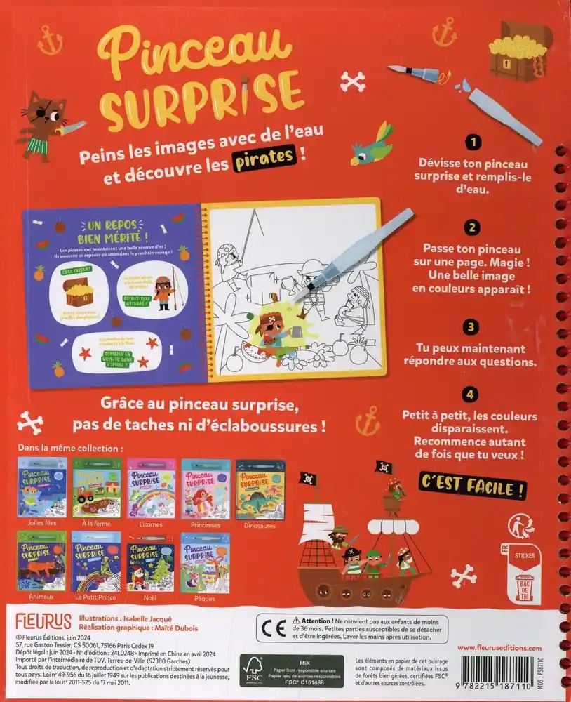 Découvrez le Pinceau surprise - Pirates de Fleurus, un livre de coloriage magique à l'eau pour enfants dès 3 ans. Peignez sans vous tacher et recommencez à l'infini !