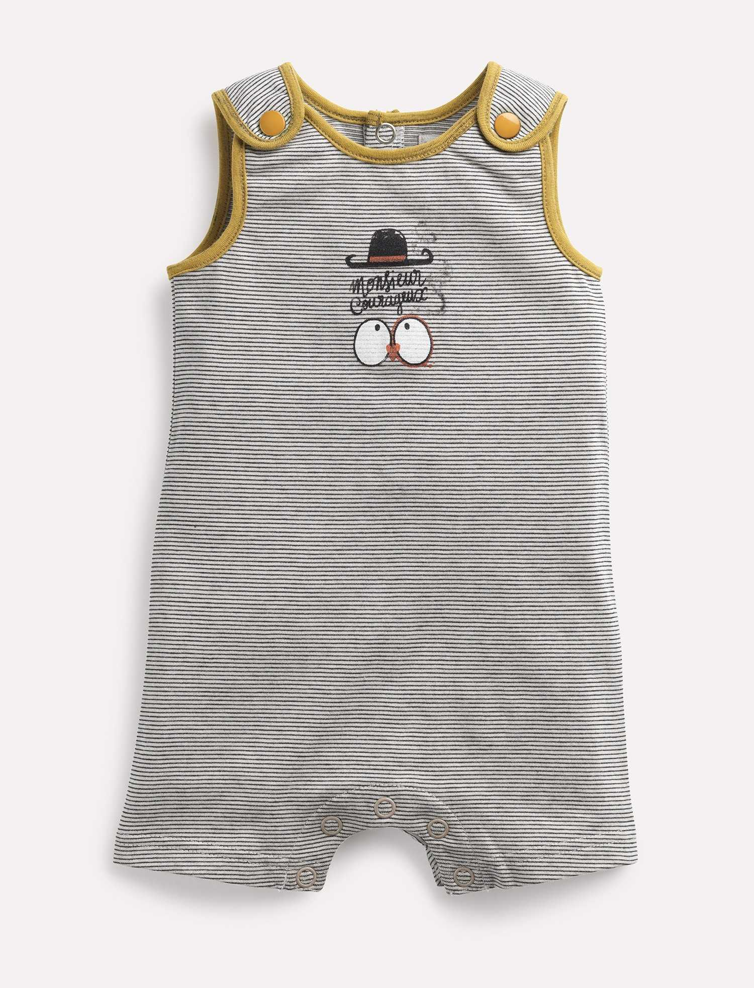 Combinaison douce et confortable, à bretelles, jambes courtes, coupe droite en jersey rayé noir et blanc, gansée ambre, avec sérigraphies chapeau melon et 2 grands yeux rigolos en relief. Fermeture entrejambe par boutons - pression.