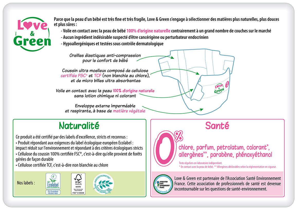 - Les couches Love & Green sont les premières couches avec un contact peau 100% d’origine naturelle et certifiées par Ecolabel ! Le label écologique Ecolabel distingue les produits qui ont un impact réduit sur l’environnement et qui répondent à des critères écologiques stricts. Il s'agit d'un label Européen.