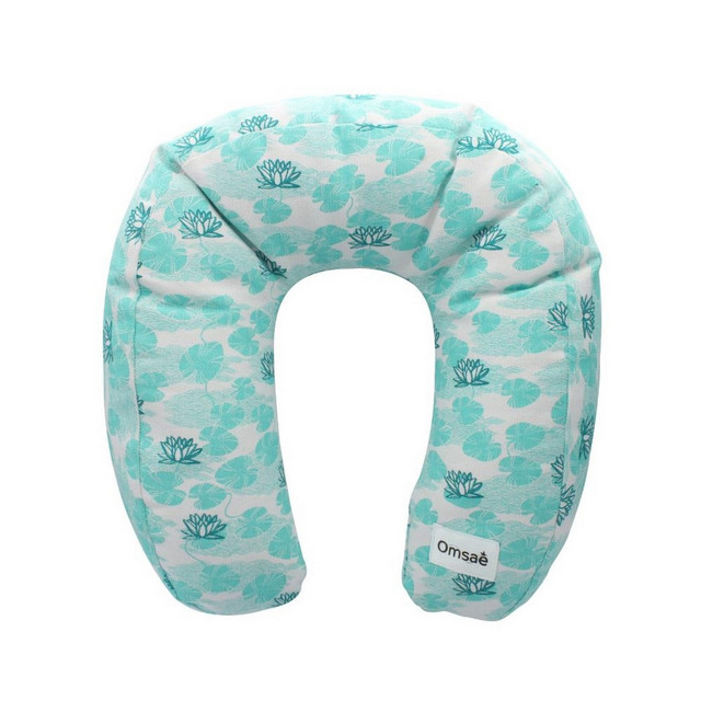 Coussin relaxant pour les cervicales, chauffant. Garnissage en coques de sarrasin. Housse en toile de coton biologique, facile à déhousser, lavable à 40°. Motif lotus vert imprimé. Dimensions 29 x 27 x 10 cm.