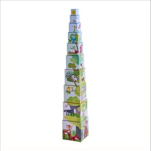 Les Cubes à empiler Les amis de la forêt de Haba sont un jeu éducatif en carton pour enfants dès 12 mois, favorisant la motricité fine et l'apprentissage des chiffres de 1 à 10.