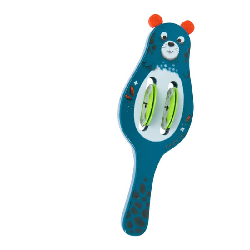 Les cymbales panthère de Moulin Roty, issues de la collection 'Dans la jungle', sont un instrument en bois et métal, décoré de Zimba la panthère, idéal pour l'éveil musical des enfants dès 18 mois.