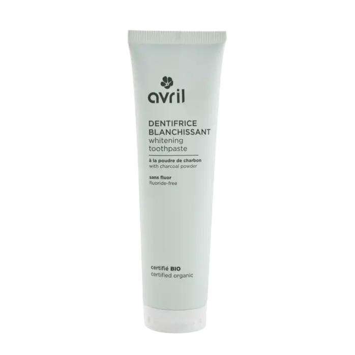Le Dentifrice Bio Blancheur 100 ml d'Avril combine poudre de charbon et aloe vera bio pour des dents plus blanches et une haleine fraîche. Sans fluor, certifié bio et végan.