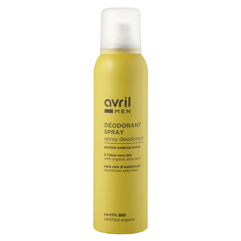 Déodorant spray Homme certifié bio Avril : protection optimale, parfum d'embrun boisé, formule fluide et légère, ne tâche pas les vêtements.