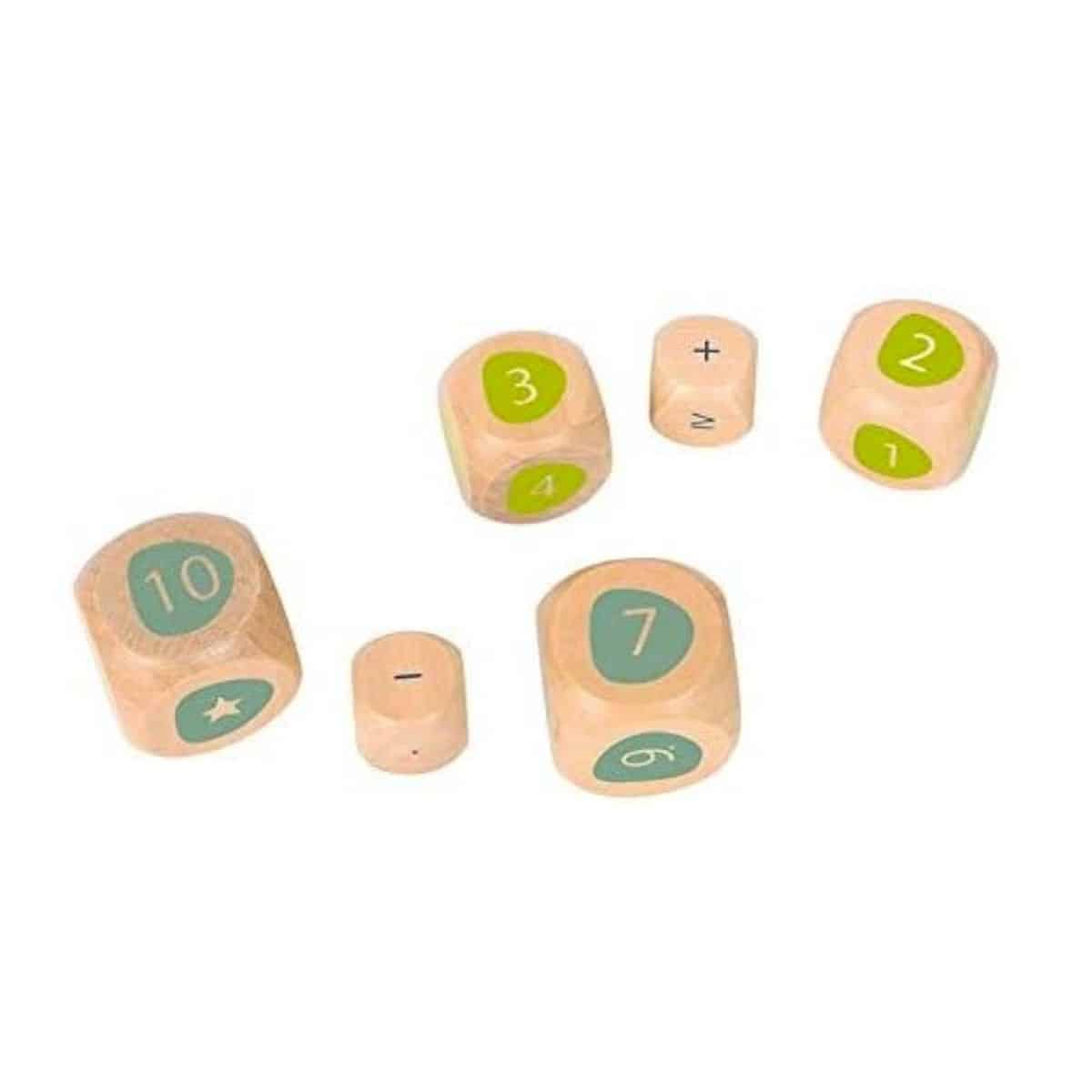 Six dés de calculs en bois certifié FSC® 100% sont inclus, avec lesquels d’innombrables combinaisons de calcul peuvent être lancées – de la simple addition et soustraction à des tâches mathématiques plus difficiles (par ex. la multiplication).