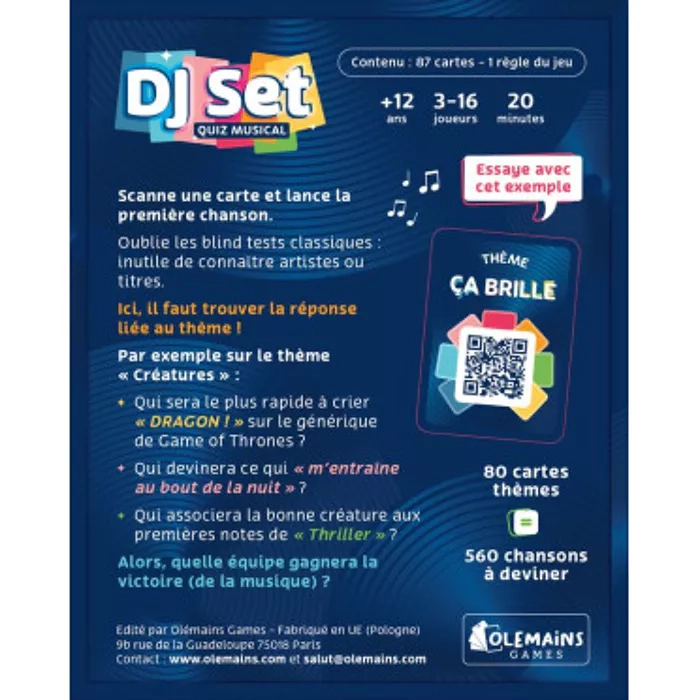 DJ Set - Quiz Musical est un jeu de société innovant qui transforme le blind test traditionnel en une expérience interactive et amusante. Avec plus de 500 chansons réparties en 80 thèmes, ce jeu promet des heures de divertissement en famille ou entre amis.