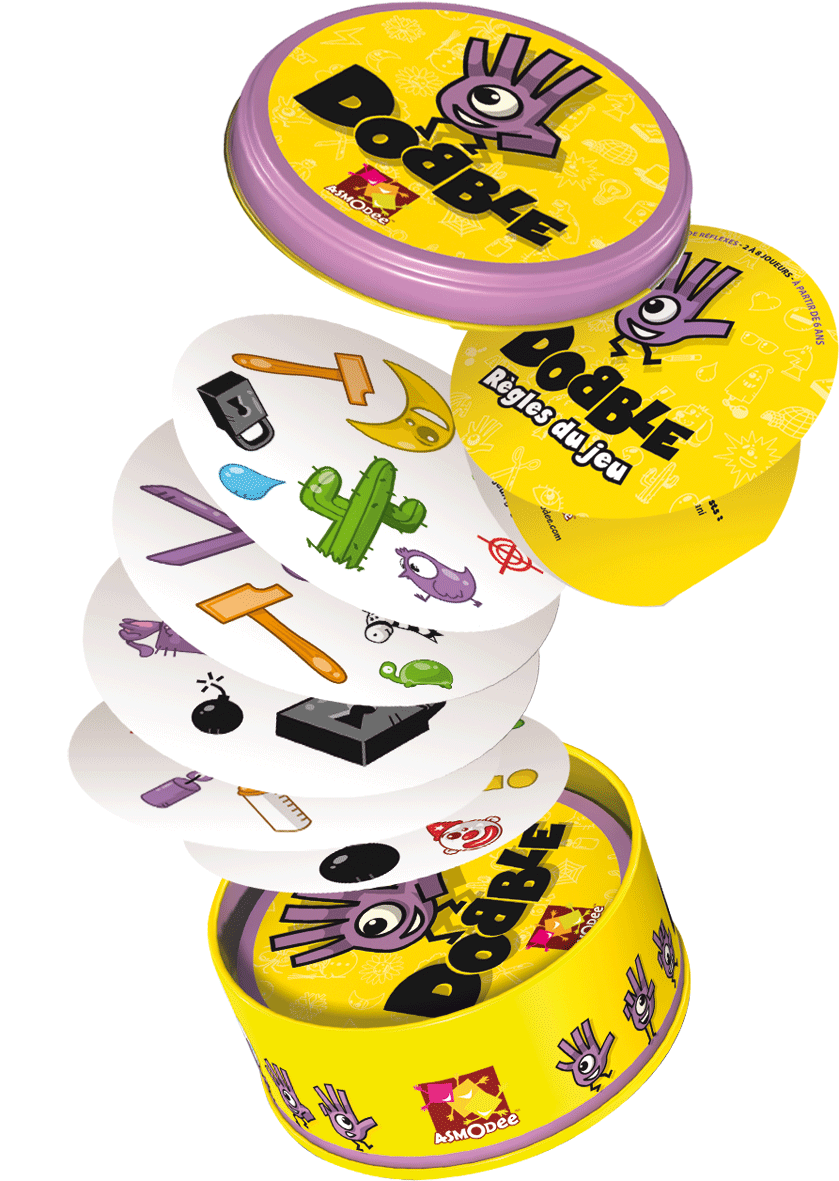 Dobble est un jeu de cartes d'observation et de rapidité où les joueurs doivent identifier le symbole commun entre deux cartes le plus rapidement possible. Avec 5 variantes de jeu et des parties courtes, il est idéal pour des moments ludiques en famille ou entre amis.