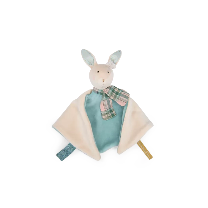 Le Doudou attache-tétine lapin bleu de la collection La petite école de danse par Moulin Roty est un compagnon doux et pratique pour votre bébé.