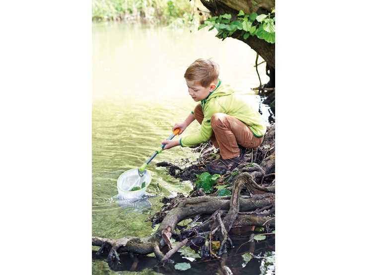Equipement de base pour tous les apprentis explorateurs et naturalistes : avec l’épuisette télescopique, on peut pêcher tout ce qui se trouve dans l’eau ou flotte sur l’eau.
