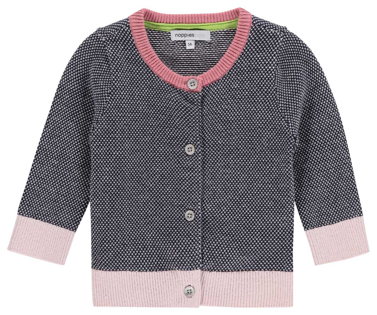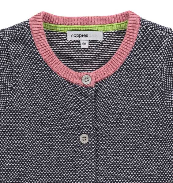 Gilet Tustin de Noppies réalisé en coton doux tricoté. Le modèle ajusté a un motif chiné et il est pourvu de bords contrastés. Le gilet a une fermeture boutonnée, pour pouvoir facilement l’enfiler à votre enfant. Par les bords côtelés, les manches restent bien en place lorsque votre bébé part à la découverte du monde. Combinez-le avec un legging ou un jean cool.
