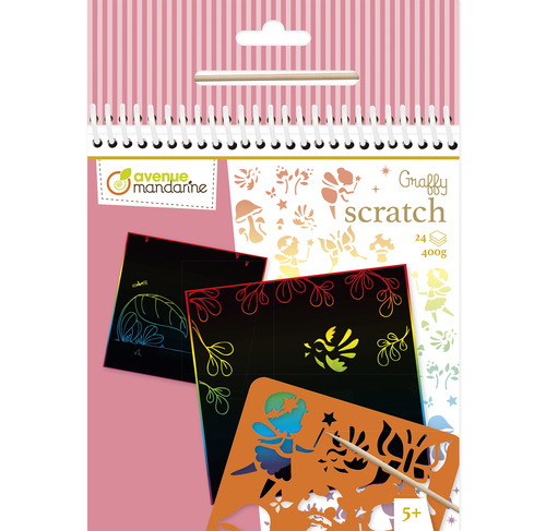 Carnet de 24 cartes à gratter avec décors pré-imprimés. Grâce à la planche de pochoirs et au stylet en bois inclus, chacun pourra laisser libre cours à son imagination !