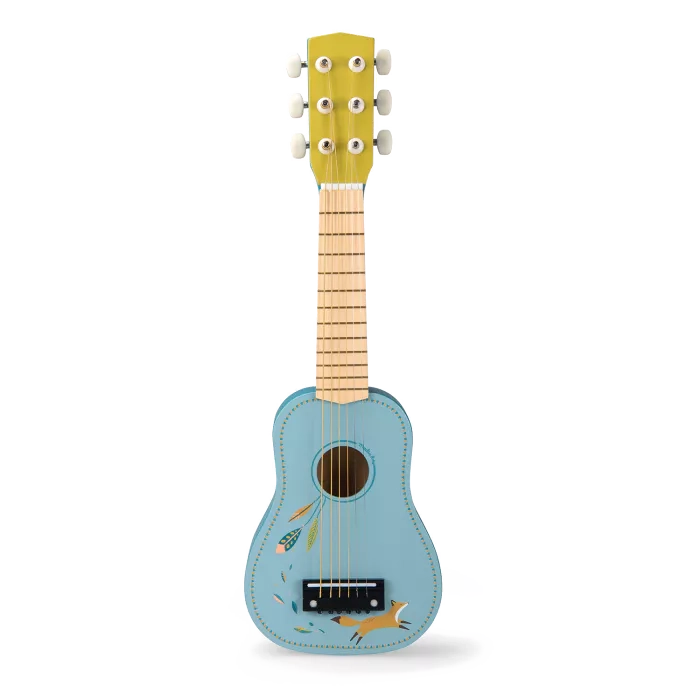 Guitare en bois 'Le Voyage d'Olga' de Moulin Roty, ornée d'illustrations poétiques, idéale pour initier les enfants dès 3 ans à la musique.
