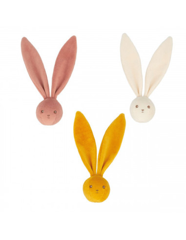 Le hochet balle Lapinoo de Kaloo est un jouet d'éveil sensoriel en velours doux avec grelot intégré, idéal pour les bébés dès la naissance. Ses grandes oreilles permettent de l'accrocher facilement, et sa taille compacte est parfaite pour les petites mains.