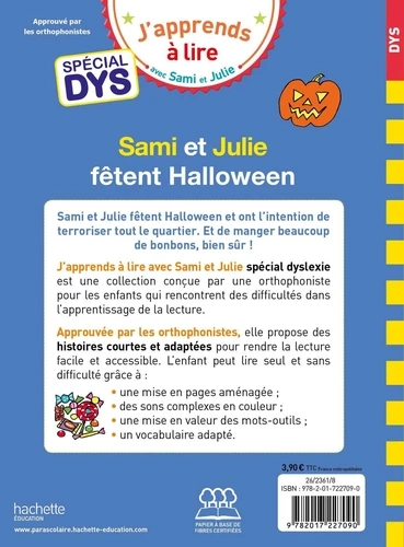 J'apprends à lire avec Sami et Julie fêtent Halloween - Spécial DYS est une histoire adaptée aux enfants dyslexiques, où Sami et Julie célèbrent Halloween en terrorisant le quartier et en récoltant des bonbons. Ce livre propose une mise en page aménagée, des sons complexes en couleur, une mise en valeur des mots-outils et un vocabulaire adapté, facilitant ainsi la lecture pour les jeunes lecteurs.