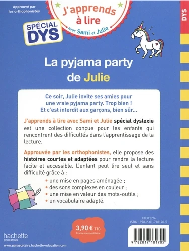 La pyjama party de Julie est un livre de la collection J'apprends à lire avec Sami et Julie, spécialement adapté pour les enfants dyslexiques. Il offre une histoire courte avec une mise en page aménagée, des sons complexes en couleur et un vocabulaire accessible, approuvé par les orthophonistes.