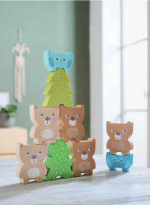 Un jeu en bois pour enfants dès 2 ans, favorisant la motricité fine et la concentration, avec des pièces à empiler représentant des animaux de la forêt.