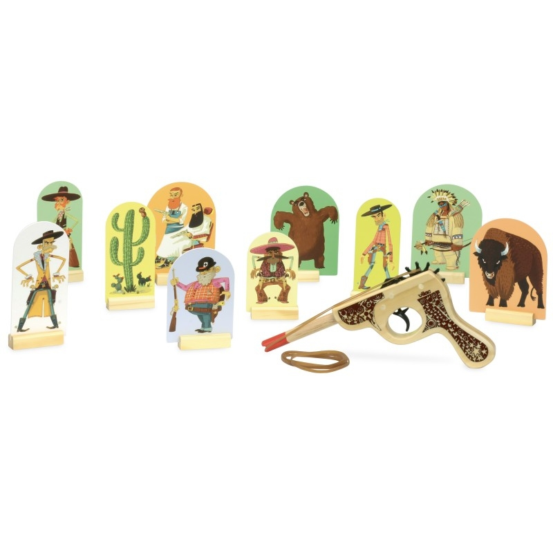 Jeu de pistolet à élastiques avec cibles en bois sur le thème du Far West, conçu par Vilac. Idéal pour les enfants dès 3 ans, ce jouet favorise l'adresse et la précision.