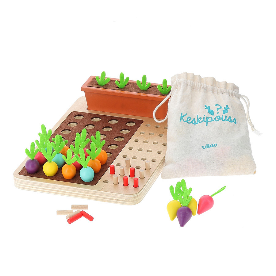 Keskipouss - Jour de récolte est un jeu de déduction en bois pour enfants dès 5 ans. Devinez la combinaison secrète de carottes cachées dans le potager et développez logique et observation.