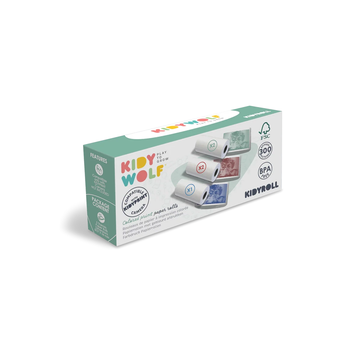 Le pack KIDYROLL comprend 5 rouleaux de papier thermique coloré, spécialement conçus pour l'appareil photo KIDYPRINT de KIDYWOLF. Grâce à la technologie d'impression thermique, ces rouleaux permettent d'imprimer instantanément des photos sans utiliser d'encre, offrant ainsi une expérience ludique et créative aux enfants.