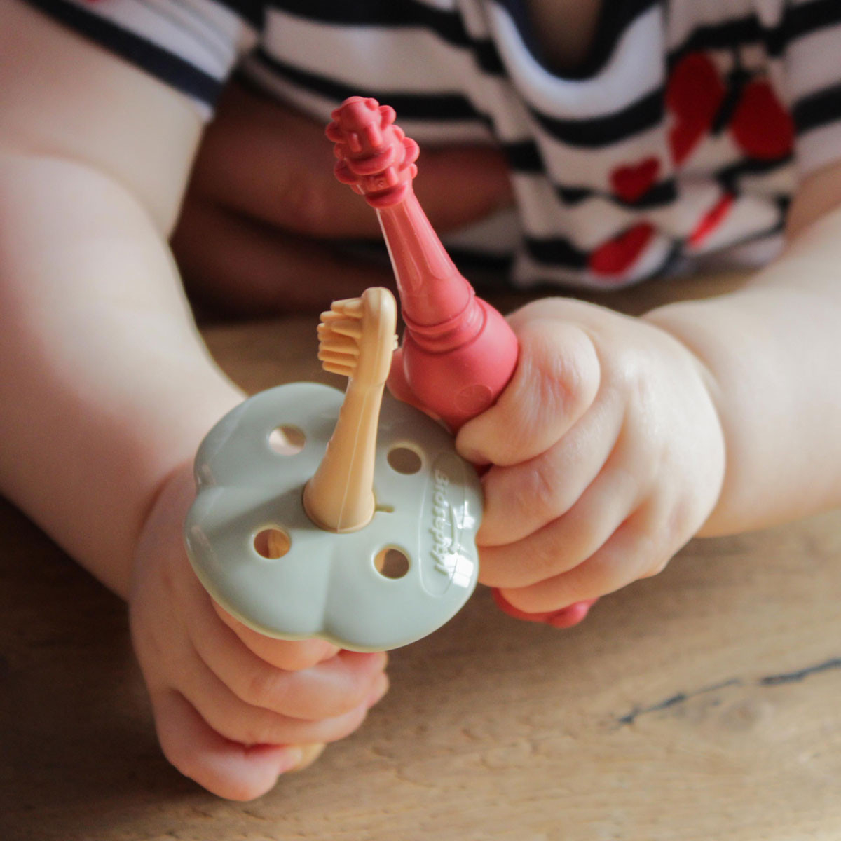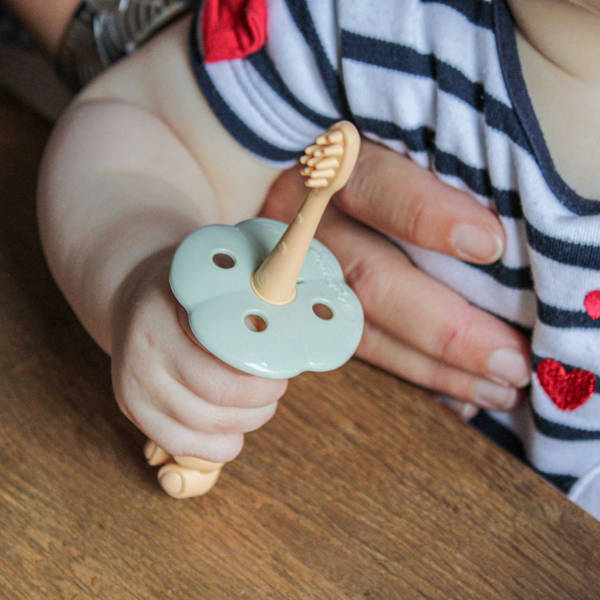 La Mâchouille, avec sa petite tête de brosse à dents, masse les gencives et nettoie les premières dents de lait pour familiariser bébé avec le brossage.