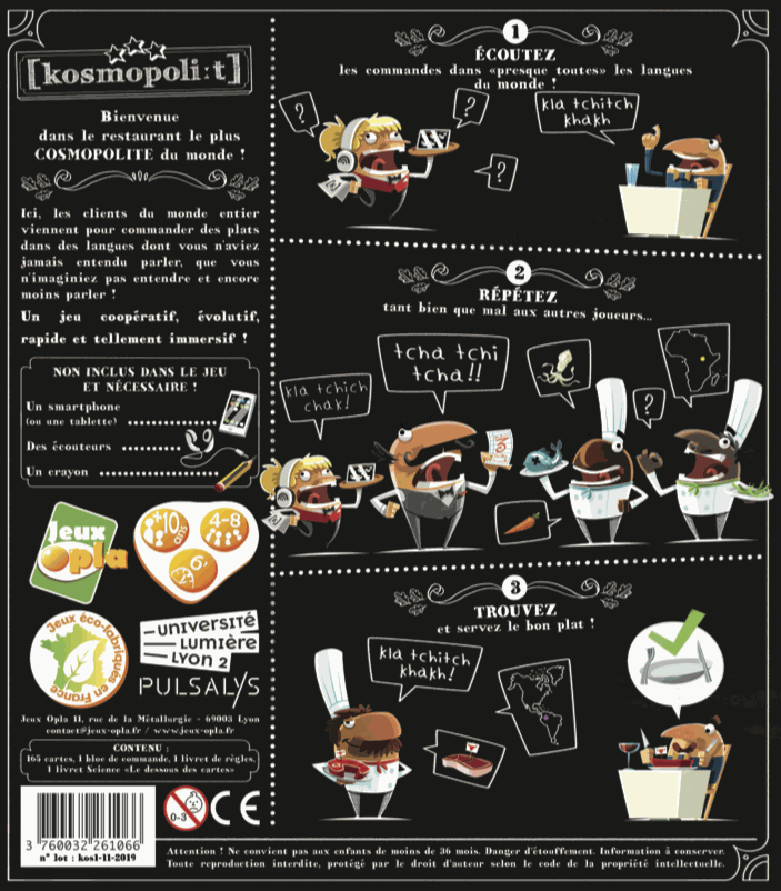 Kosmopoli:t est un jeu de société coopératif où vous gérez un restaurant cosmopolite, servant des plats du monde entier dans plus de 60 langues. Travaillez en équipe pour comprendre les commandes et satisfaire vos clients dans des parties rapides et immersives.